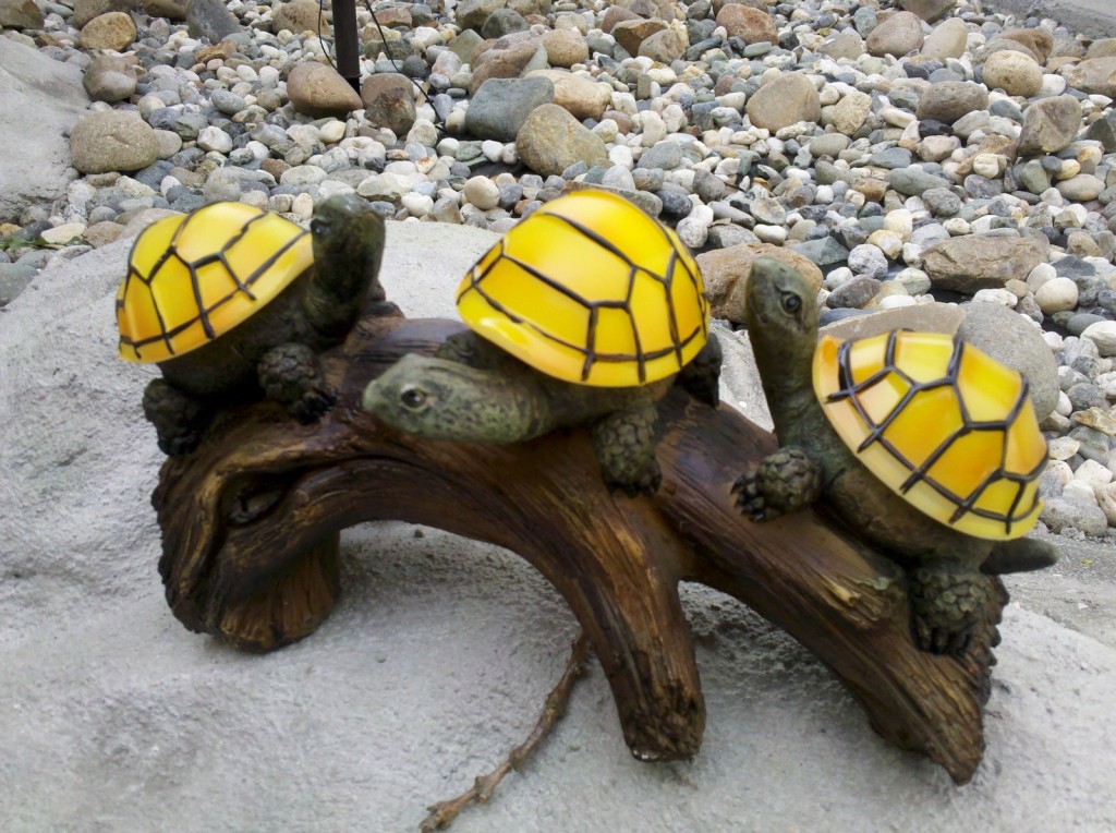 While shopping for lights, I found these little guys. They’re solar powered, so their shells light up at night. Quite cool.
