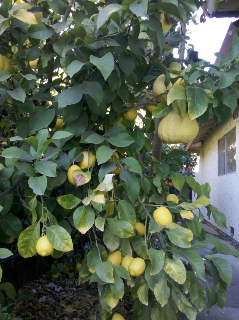 When I first moved into my house in Davis, I was happy to find a lemon tree in my backyard. (Well actually it’s more like my side yard.) Despite my complete neglect the tree never fails to provide a ton of lemons every winter (and for some reason this year it started producing some mutant sumo lemons. They’re huge– bigger than grapefruits or pomelos even.) There’s more lemons than I know what to do with, so if you want lemons, just let me know.