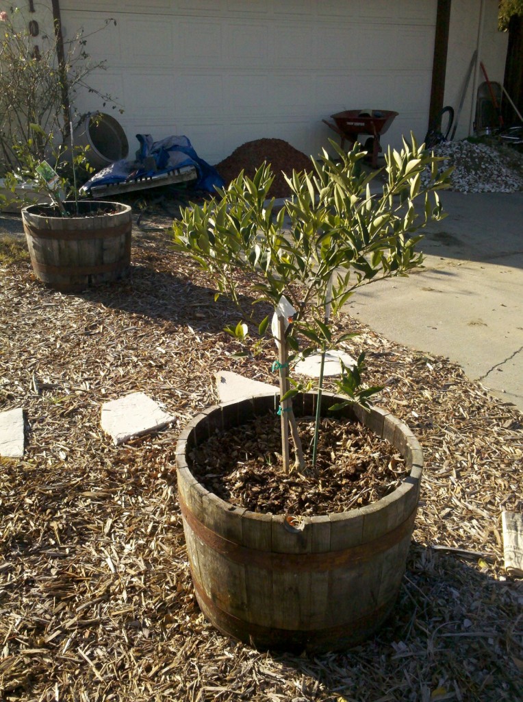Since citrus trees seem to grow so well at my house, I decided to plant a few in my front yard this past year. I wanted fruits that were not as common in stores, so I ended up buying a thai lime tree and a mandarinquat tree. The mandarinquat tree in the foreground seems to be doing pretty well– it has some fruit on it already. The lime tree in the far barrel is not doing as well, it will probably be another year or two before it starts producing limes.